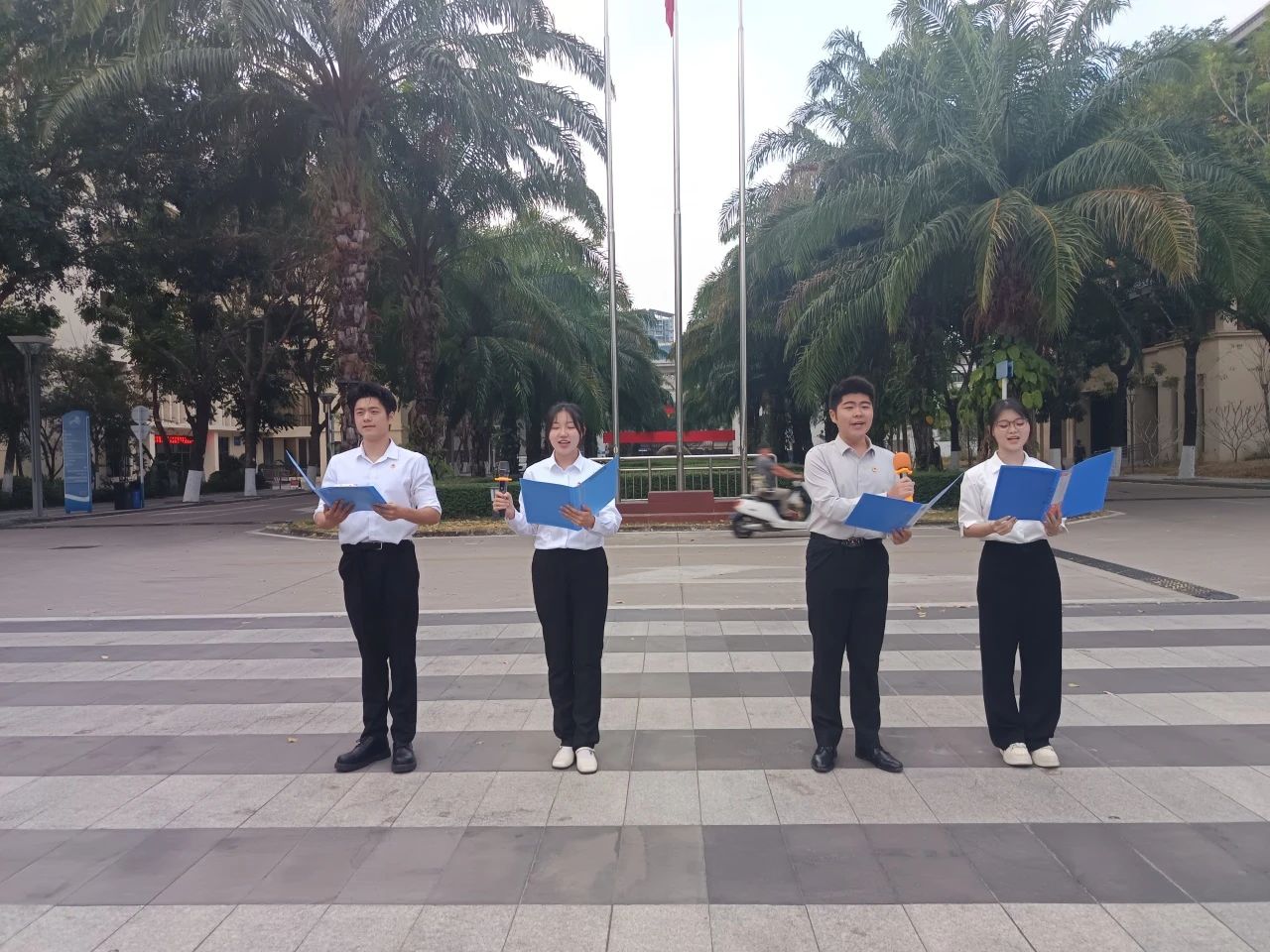 二、人文社会科学公司员工种一鸣、李韧达、梁子涵、王惠代朗诵《青春与信仰的对话》,号召师生将个人理想融入国家发展大局,以"闯海人"的拼搏精神投身海洋科研、生态保护与自贸港建设,用青春热血续写新时代的雷锋故事,让初心在鲜红党旗下历久弥坚,让奉献之光照亮南海碧波。